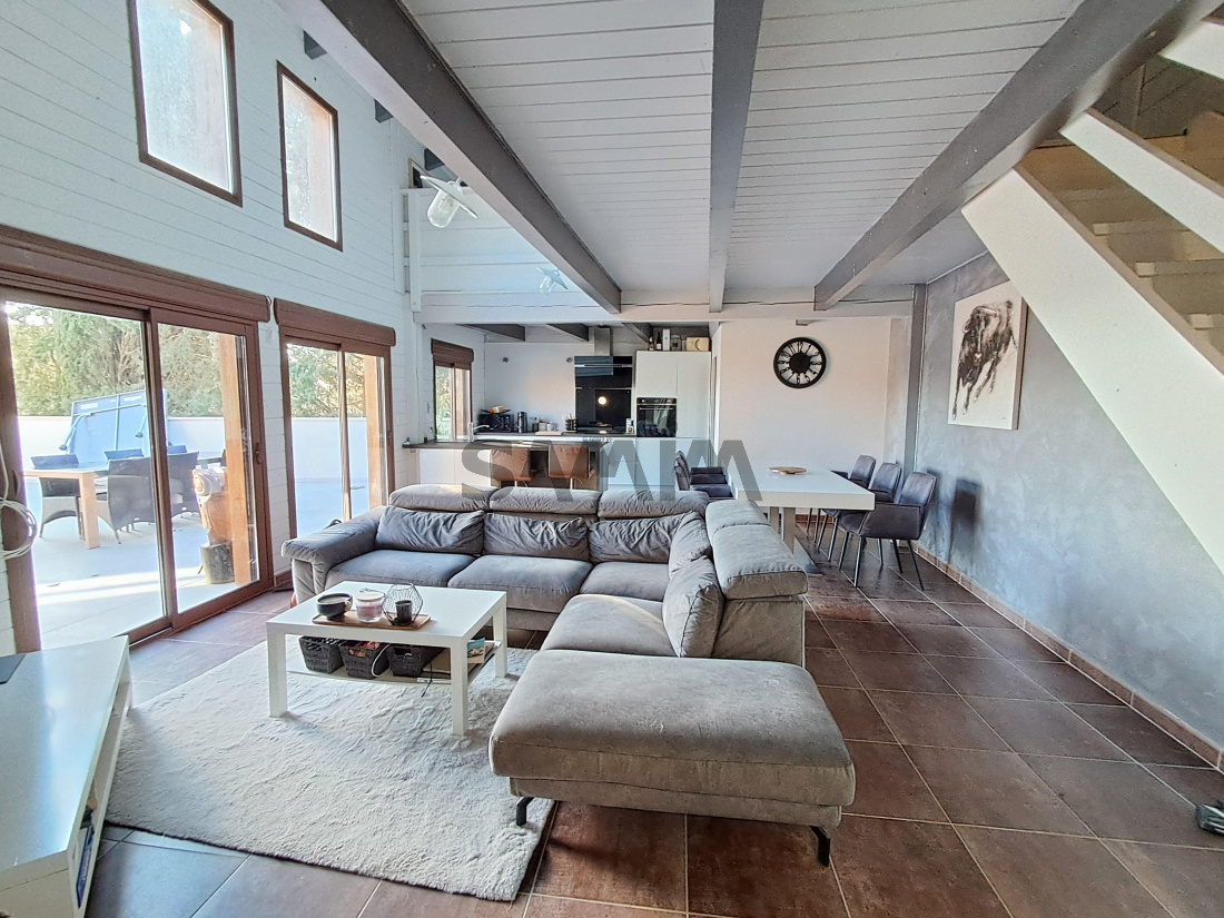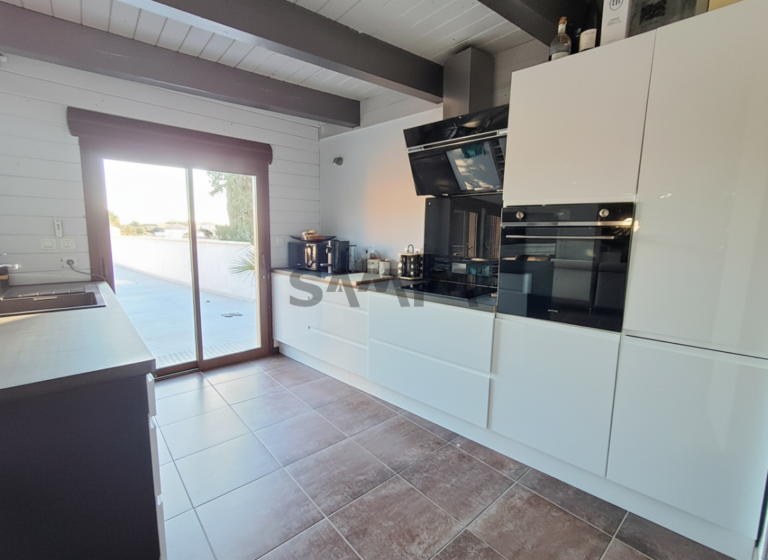 Une cuisine entièrement équipée s'ouvre sur un espace salle à manger et salon. Toutes les pièces du rez de chaussée s'ouvrent directement sur une immense terrasse